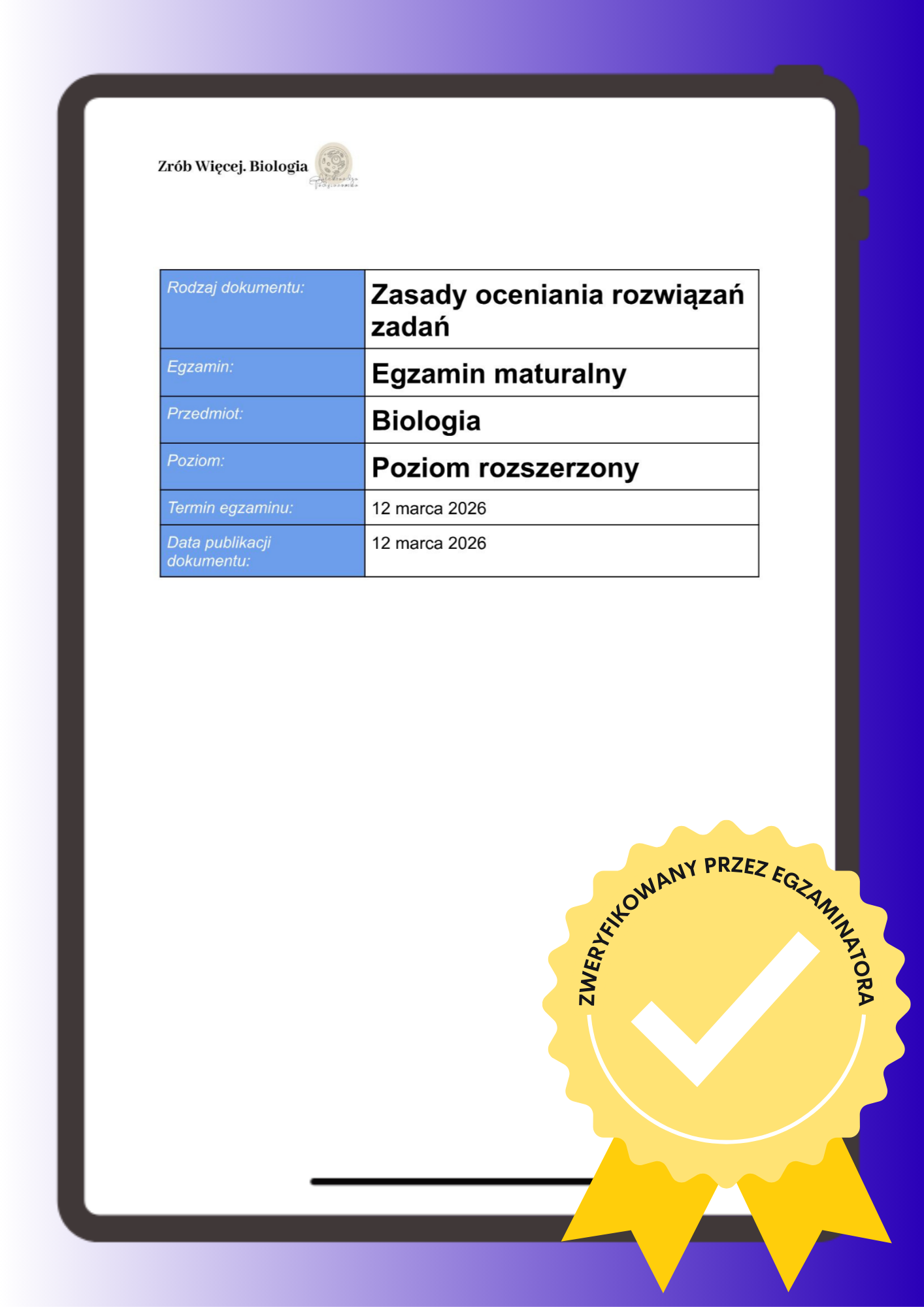 Arkusz wraz ze schematem oceniania oraz omówieniem wideo zostanie wysłany na podany przy zakupie adres e-mail 12 marca 2026 w formie pliku PDF. Wypełniony arkusz należy odesłać na adres e-mail, z którego otrzymają Państwo produkt w formie pliku PDF (wypełniony elektronicznie lub zeskanowany po wydrukowaniu i wypełnieniu ręcznym) celem indywidualnego sprawdzenia. Po sprawdzeniu i ocenie arkusza zostanie on odesłany wraz z komentarzem.